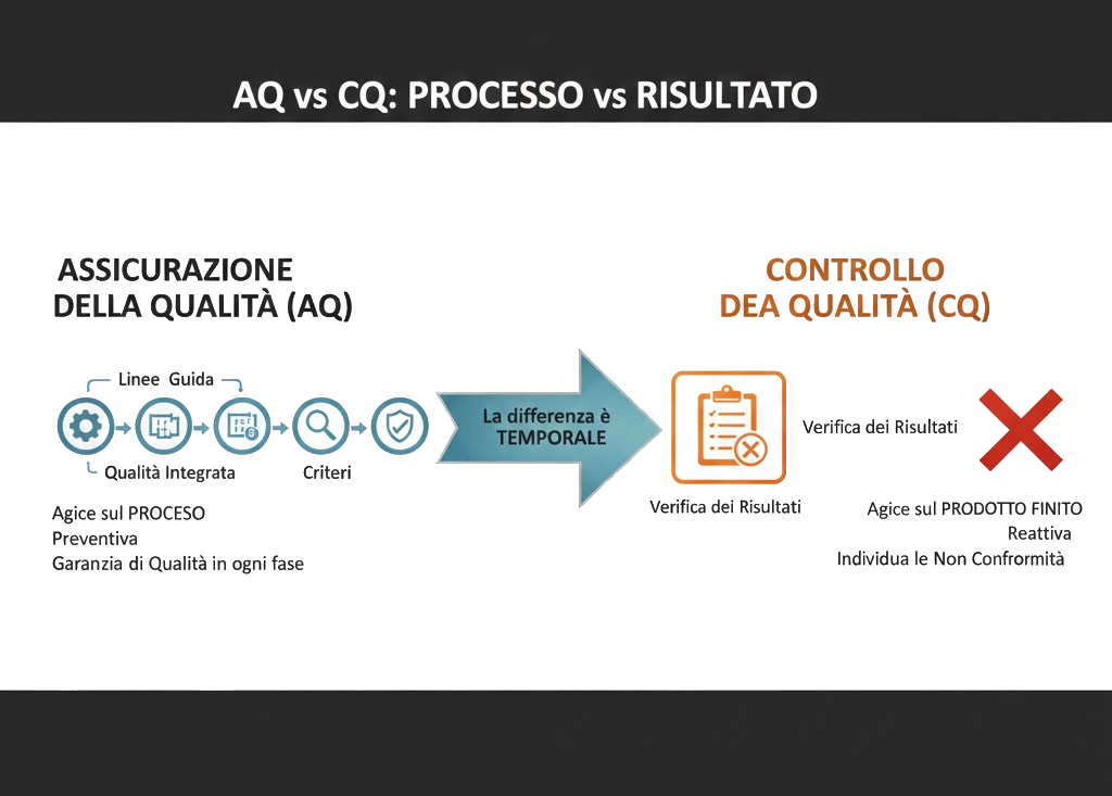 Il Controllo della Qualità (CQ) interviene invece a valle per verificare i risultati prodotti. Il suo scopo è individuare eventuali non conformità una volta che il processo è terminato.